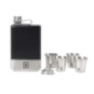Gavesett fra Swiss-Tec med lommelerke, trakt og fire glass i rustfritt stål. Leveres i fin gave-eske.
